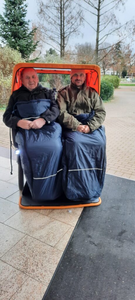 Daß die Bürstädter Rikscha auch im Winter genutzt werden kann, wurden Schlupfsäcke angeschaft, die sehr gut gegen Wind und Kälte die Gäste bei einer Rikschafahrt schützen . Voller begeisterung wurden sie von den Bewohnern des Altenheims St.Elisabeth ausprobiert! Jetzt kann der Winter kommen !
